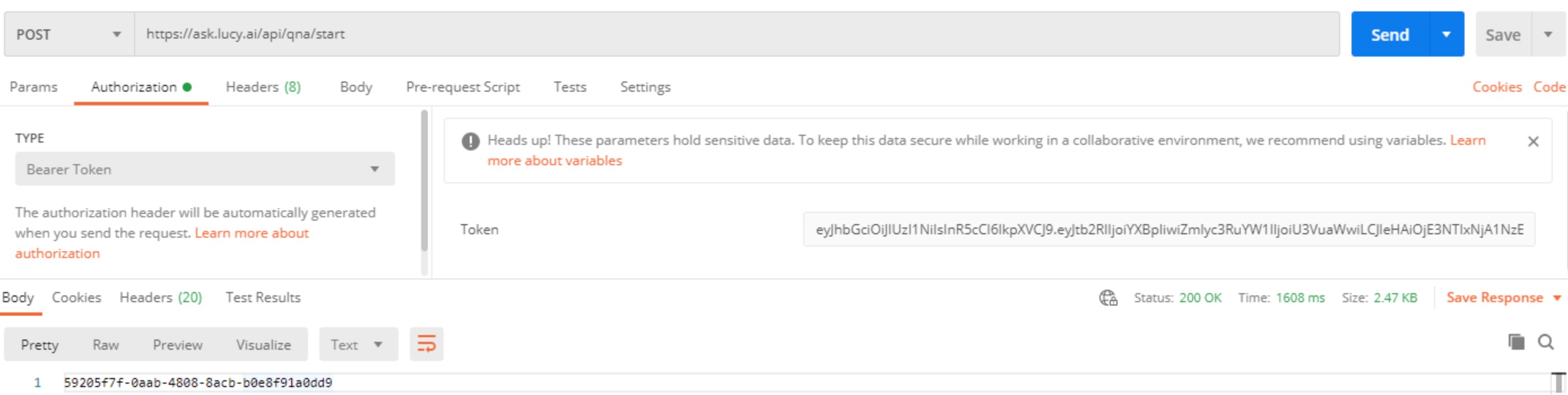 curl --location --request POST 'https://ask.lucy.ai/api/qna/start' \ --header 'Authorization: Bearer JWT_Token'