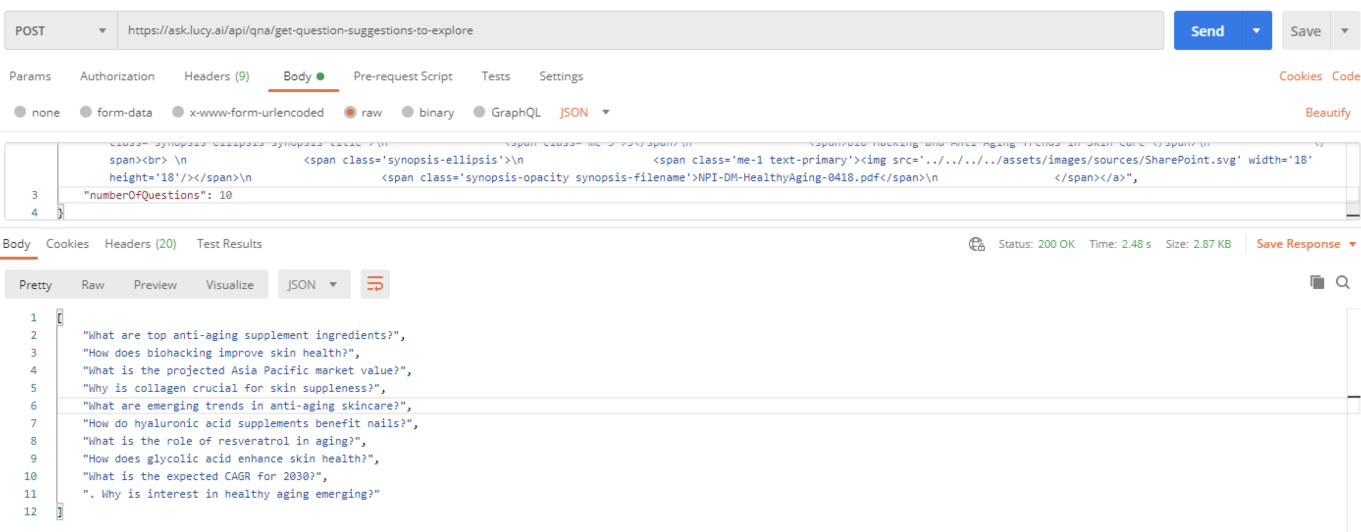 Explore more questions Endpoint will return number of questions based on the request payload as JSON array of strings