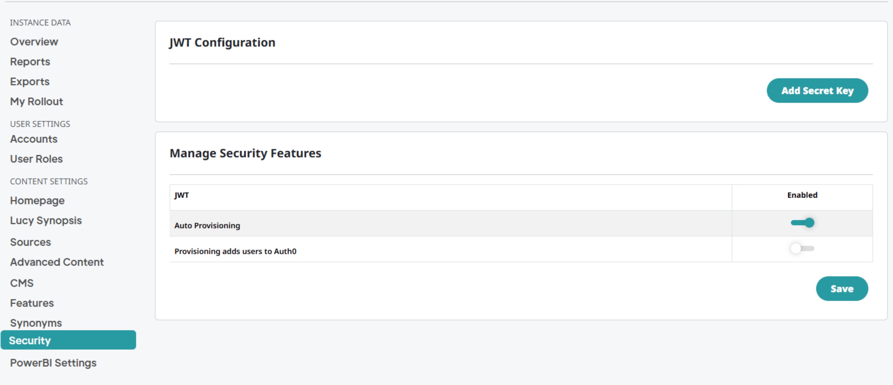 Settings → Security → JWT Configuration → Add Secret Key - Click Add Secret Key